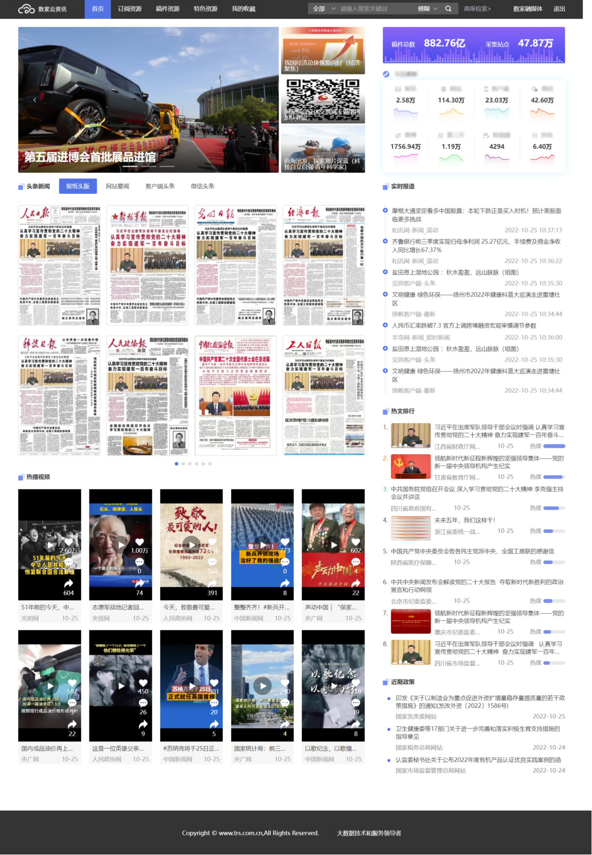 將數字報、網站、新聞客戶端、微信、微博、第三方平臺、短視頻平臺的內容數據進行結構化分類整合,以“云服務”的方式滿足用戶對互聯網資訊內容的數據需求,可實現內容精細化檢索、個性化訂閱、基礎渠道數據供給、特色資源數據供給,可根據用戶實際數據需求分析自動對接數據到用戶的應用系統中。