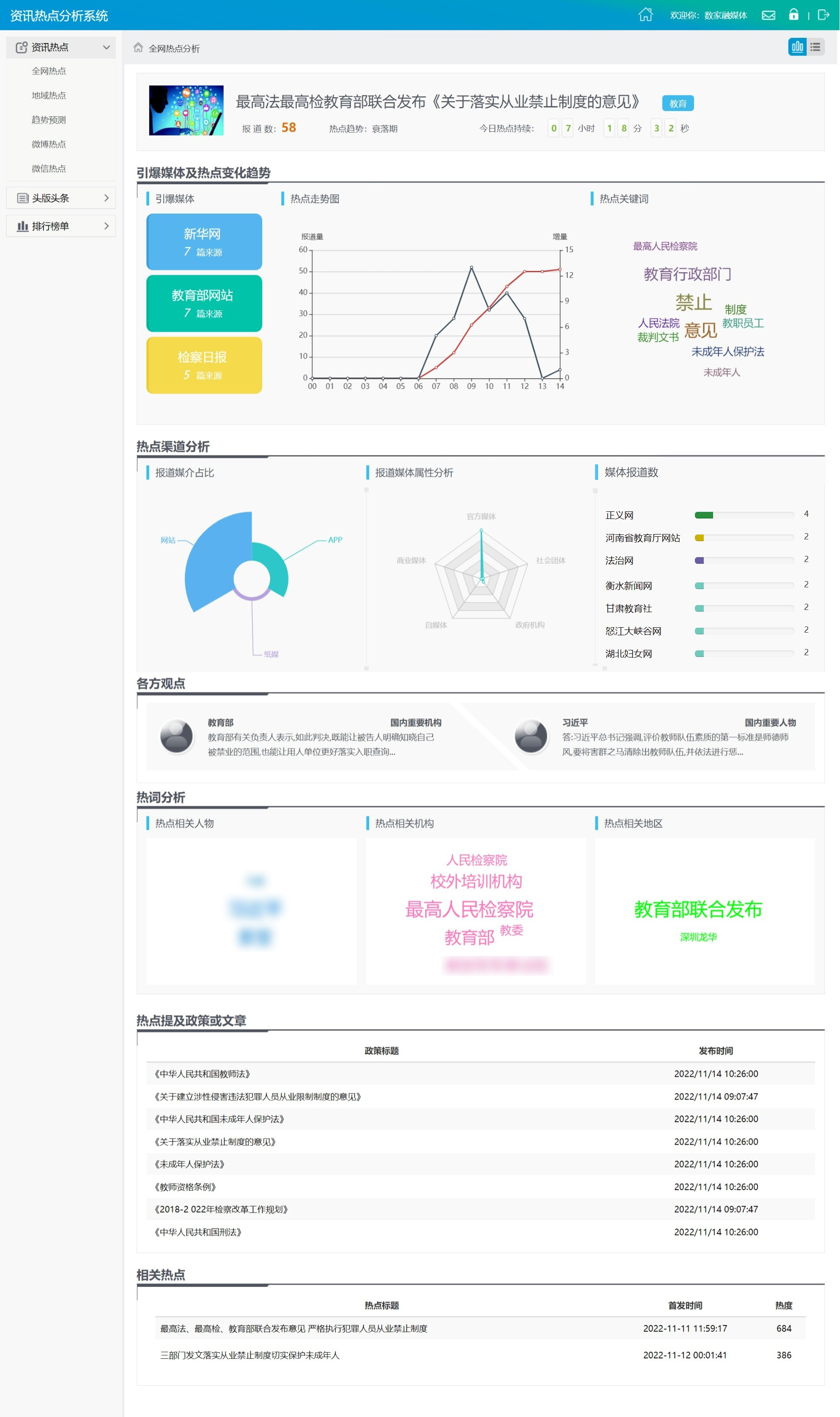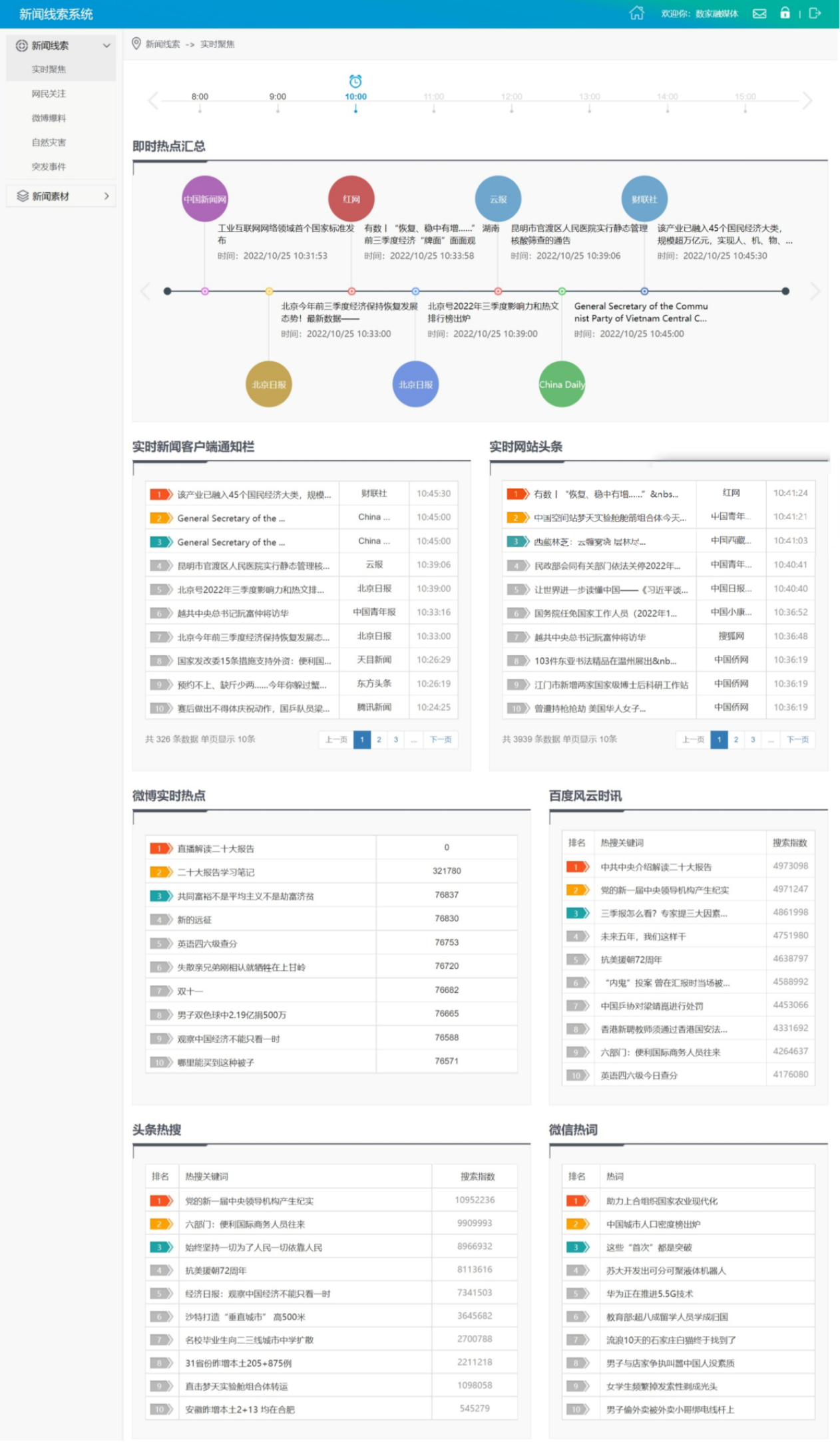 利用大數據分析技術從海量的互聯網數據中發現當前資訊傳播熱點,實現對不同行業、不同地域的熱點信息聚類。所有熱點數據提供基礎屬性要素的提取,多層級的分析下鉆和深度語義分析,包括行業熱點、地域熱點、英文熱點、趨勢預測、頭版頭條、微博熱點、微信熱點、排行榜單等模塊。支撐內容創作的選題研判和熱點趨勢的多角度掌控。