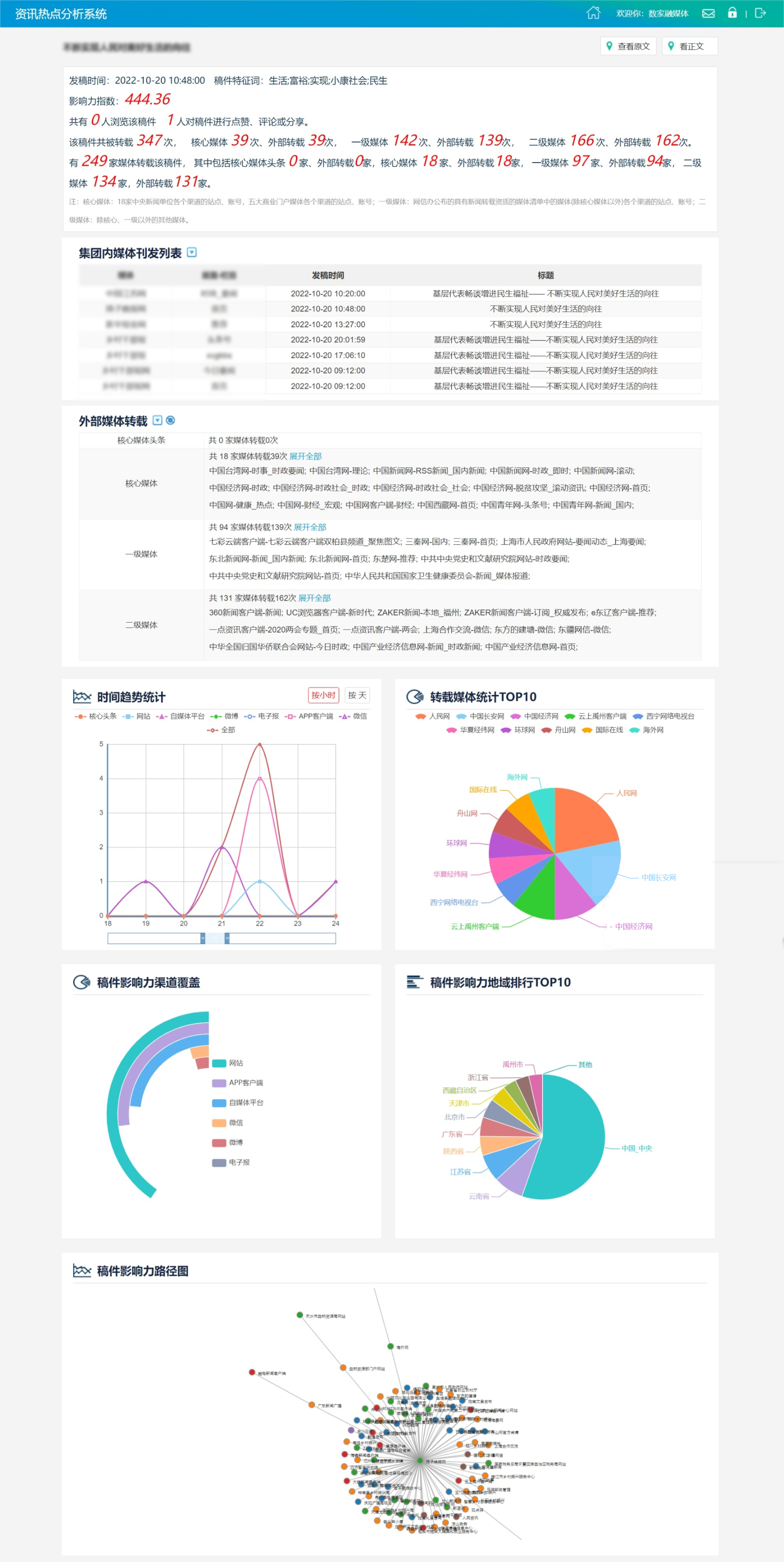 基于報紙、網站、微博、微信、客戶端、第三方公眾平臺抓取到的數據,運用原創內容識別、文本相似度分析等大數據分析技術,結合稿件傳播影響力數據模型和指標體系,對原創稿件的全網傳播效果進行持續性的實時分析,包括傳播轉載分析、閱讀互動分析、傳播軌跡可視化分析和多維報表自動生成等。