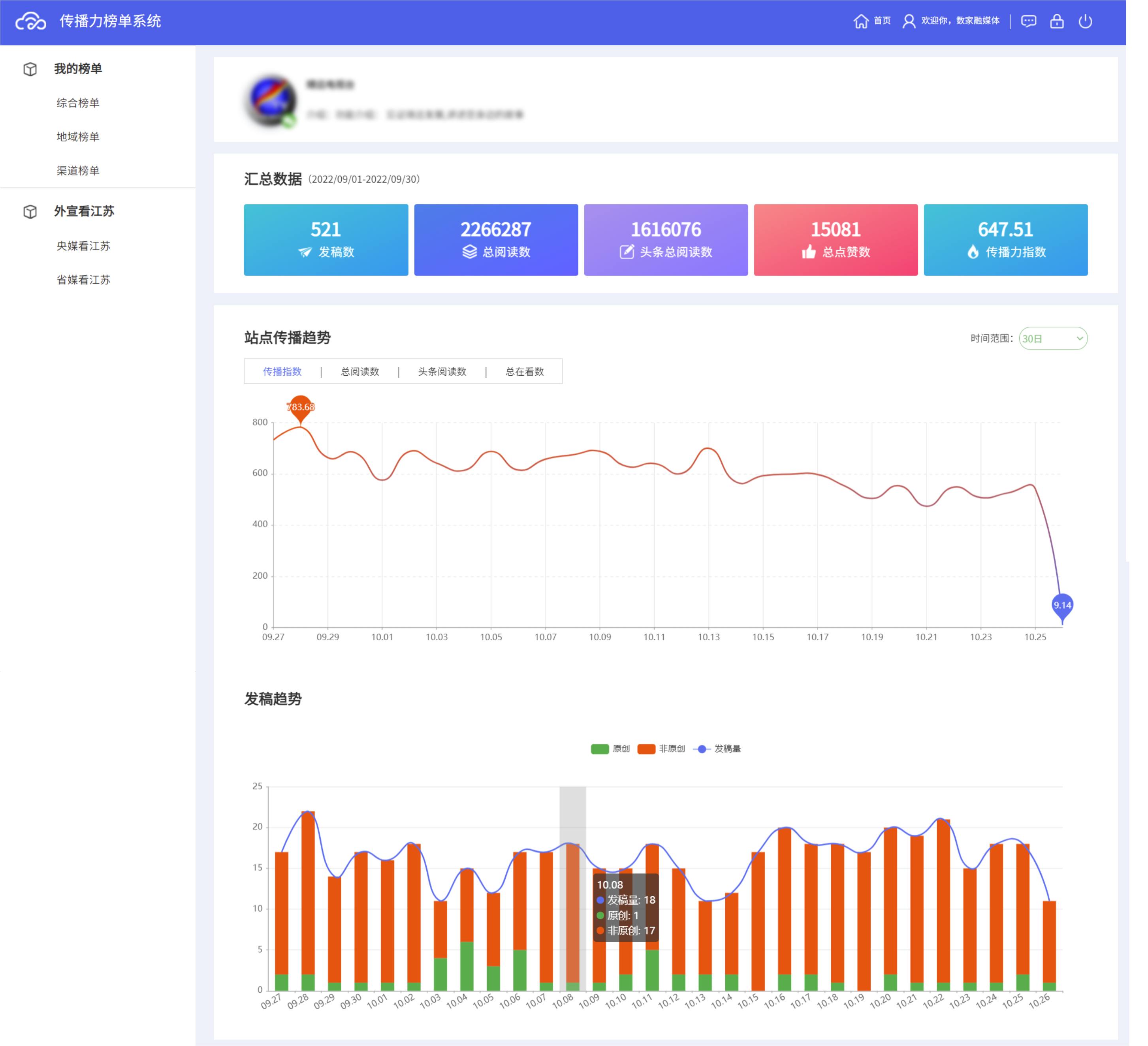 對海量互聯網傳播數據進行實時監測,基于科學系統的評價指標體系,構建權威榜單,實現全渠道、多維度、跨周期的站點排行、賬號排行、內容排行、定制化專題排行及跨渠道機構綜合排行。為用戶衡量宣傳主體的傳播力、發掘優質內容提供依據,有效助力內容傳播運營。