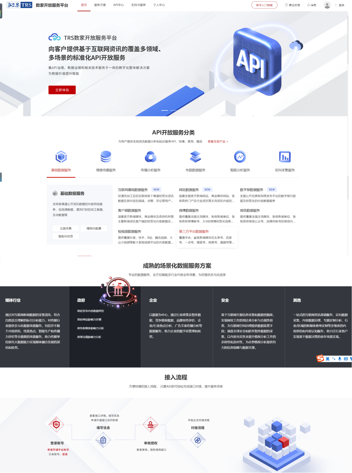 提供基于互聯網資訊的覆蓋多領域、多場景的標準化API開放服務。數家將多年積累的業務經驗和技術優勢以API的方式對外開放,采用一站式接入服務,提供專業的技術支持與API文檔、調試工具及示例,全程為開發加速。目前平臺提供200余種API接口,涵蓋基礎數據服務、增值場景服務、智能分析服務、傳播分析服務、專題分析服務、定向采集服務,全方位賦能多元內容業務場景,為用戶提供豐富的選擇。