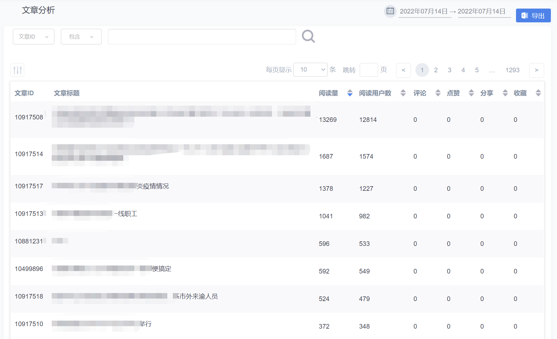 對于政務、新聞資訊等APP或網站,文章的閱讀量或閱讀文章的用戶數是最核心最有價值的數據指標之一。文章分析功能可以精確統計每一篇文章的閱讀量、用戶量、互動量等數據指標。