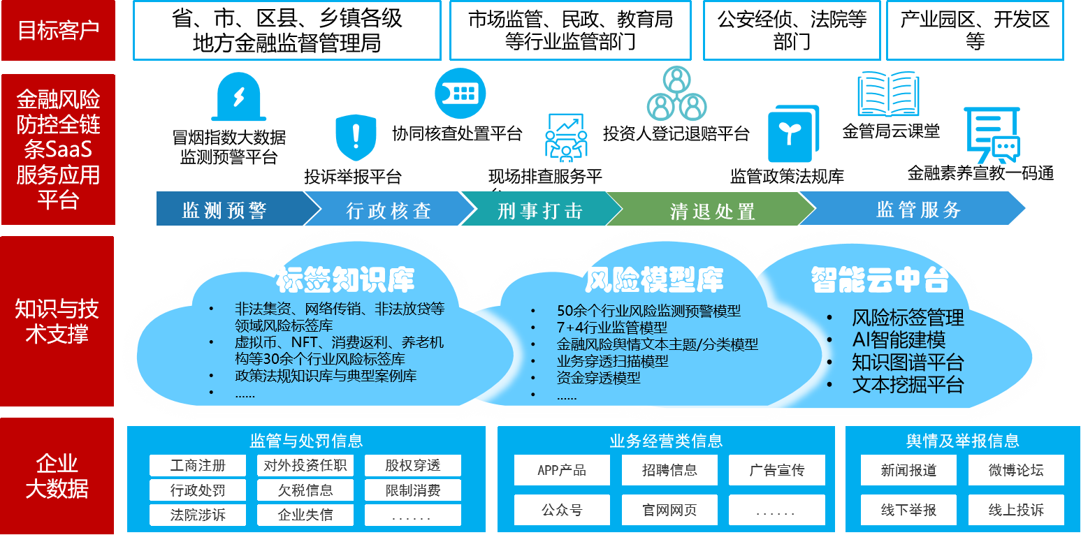 冒煙指數聚焦地方金融風險防控,基于對企業大數據的采集、分析,金融風險特征提取、標注,預警模型搭建,及對“主動監測-分級預警-量化分析-核查化解-分類處置”全業務流程的梳理研究,形成金融風險防控全鏈條產品體系,致力于運用監管科技為地方金融監管局、公安經偵、行業主(監)管等部門賦能,創新監管思維方法、提升數字化監管能力。