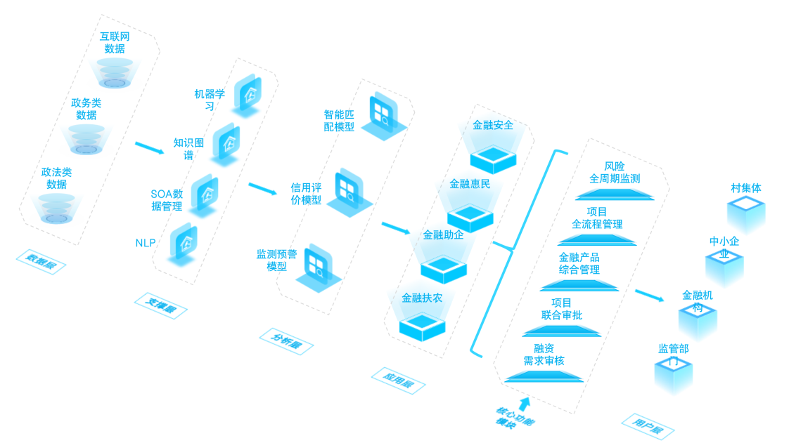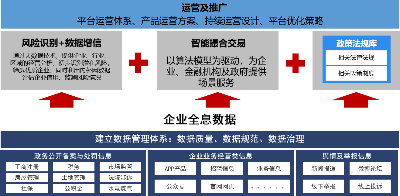 基于政務、企業上報、公開數據采集,應用大數據、人工智能、加密算等技術,搭建政府、 金融機構、企業三者之間的服務平臺,為政府、金融機構和中小微企業提供綜合性的智能化融資服務,化解中小企業融資難題。