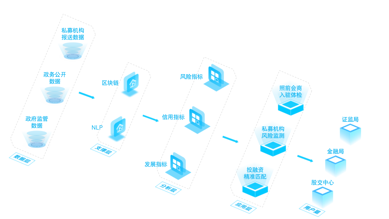 運用大數據、人工智能、云計算等監管科技手段,構建私募基金管理人和基金產品“聯合審批—登記備案—風險監管—發展服務”全生命周期監管和綜合服務體系,輔助監管部門提升審批、登記、備案和監管效率,及時發現和處置風險,為區域優質企業和私募搭建智能匹配和撮合平臺,提升資源匹配效率,助力區域經濟的高質量發展。