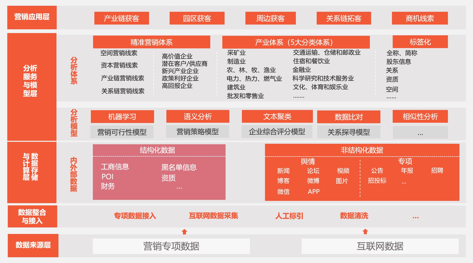 通過內外部數據的對接,協助銀行管理人員實時獲悉存量客戶的畫像以及相關動態,及時發現商機;基于產業經濟、產業鏈知識圖譜、企業數據,構建企業精準畫像,獲取營銷線索,為企業營銷拓客提供決策支持。