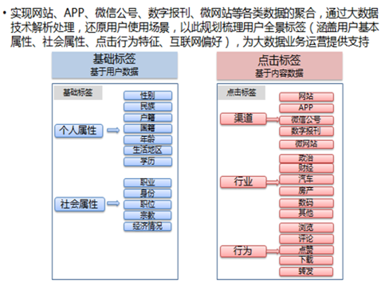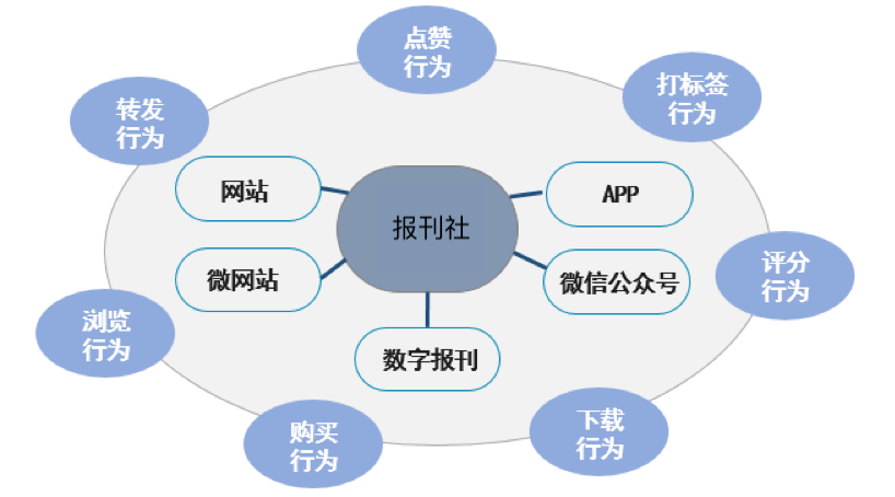 1. 用戶閱讀行為包括用戶在新聞網站、新聞APP、微信小程序、數字報刊、微網站上的各種瀏覽行為,閱讀行為數據包括:點擊數據、站內搜索數據、閱讀停留時間數據、來源網站數據、收藏數據、轉評贊數據等。