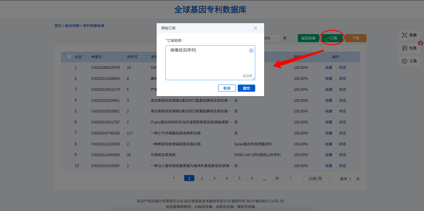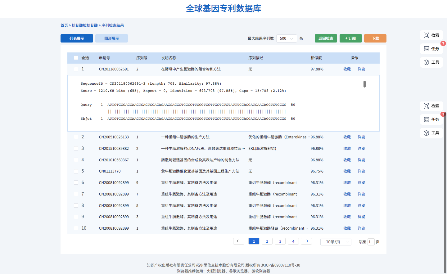 檢索結果展示序列相關專利的申請?zhí)?、序列號、發(fā)明名稱、序列描述、相似度信息,支持序列專利詳覽查看、序列收藏、圖形展示和目標序列下載;支持檢索條件一鍵訂閱,方便跟蹤目標序列的最新數(shù)據(jù)動態(tài)。