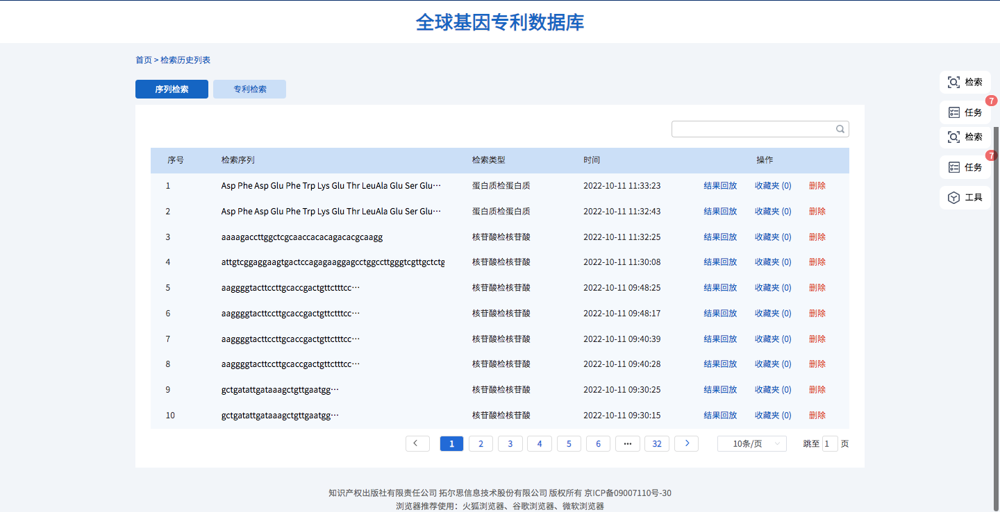 通過檢索歷史可進行檢索追溯和分析。檢索歷史支持分別查看序列檢索和專利檢索的檢索歷史,支持結果回放、收藏和刪除功能。