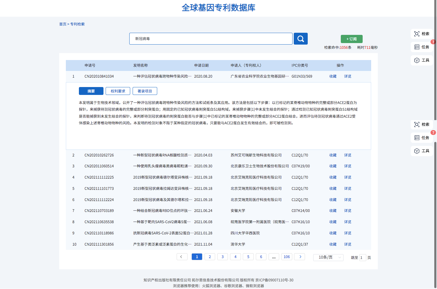 支持通過專利申請?zhí)?、公開號、分類號和關鍵詞實現(xiàn)一鍵檢索基因專利數(shù)據(jù);支持二次檢索和檢索結果收藏;支持檢索條件一鍵訂閱,方便跟蹤最新數(shù)據(jù)動態(tài)。