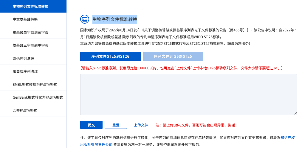生物序列轉換工具支持生物序列文件標準轉換、中文氨基酸轉換、氨基酸單字母到三字母、氨基酸三字母到單字母、DNA序列清理、蛋白質序列清理、EMBL格式轉換為FASTA格式、GenBank格式轉換為FASTA格式、合并FASTA格式。