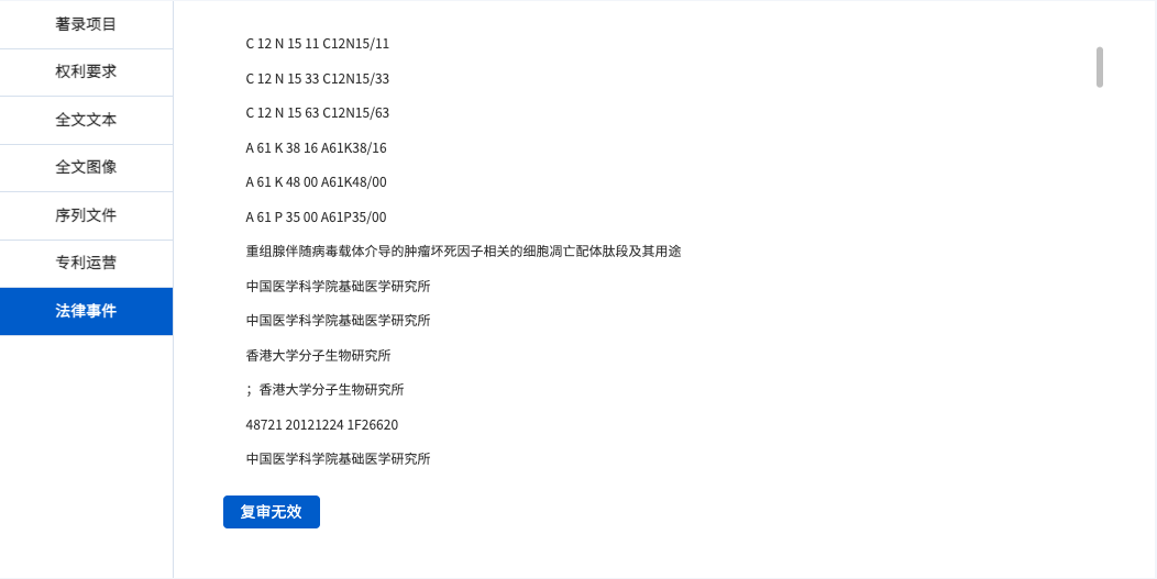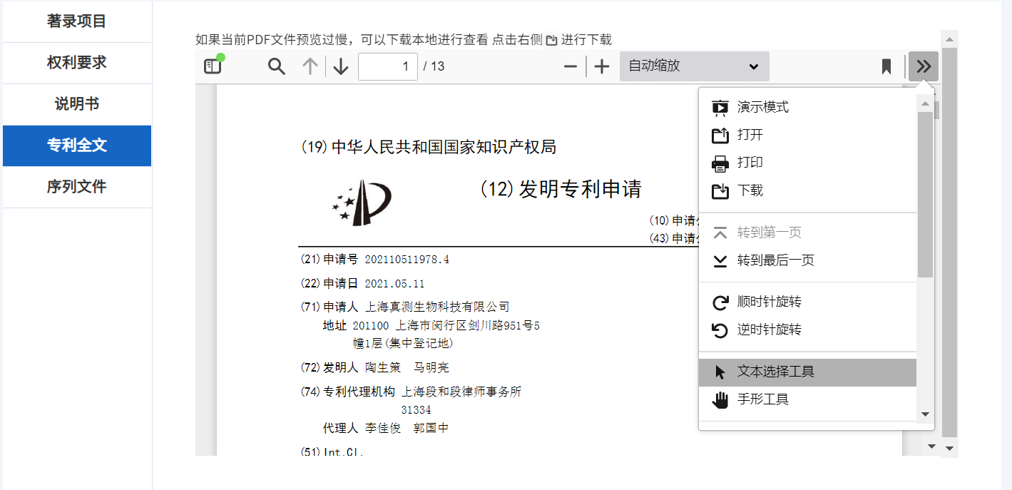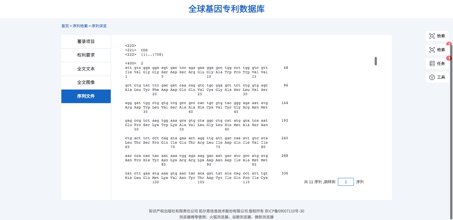 序列詳覽提供基因專利著錄項目、權利要求、說明書、專利全文PDF以及序列文件、運營數(shù)據(jù)和法律事件信息的查看。