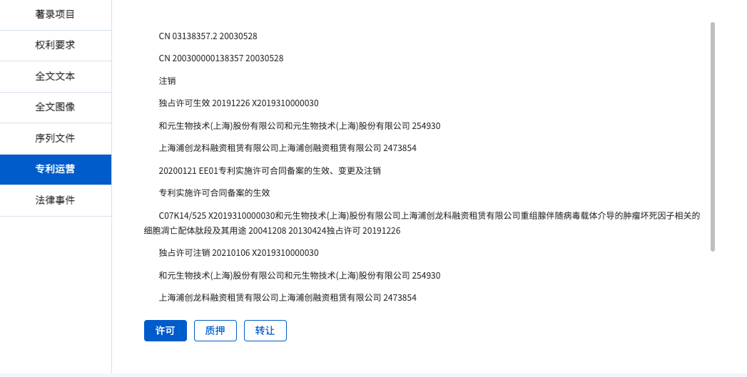 專利運營數(shù)據(jù):許可/質押/轉讓信息查看