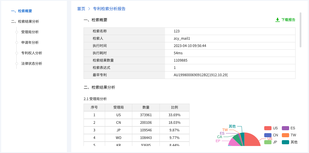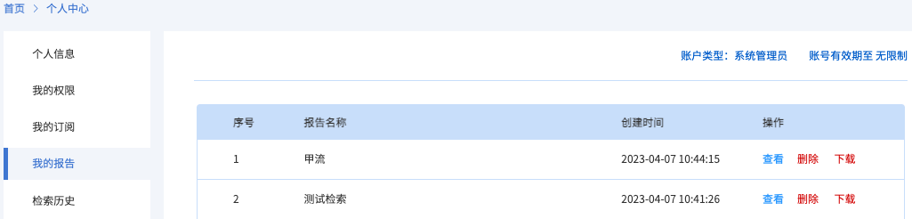 個人中心-我的報告中,可以查看所有檢索報告,可對檢索報告進行查看/刪除/下載,等操作