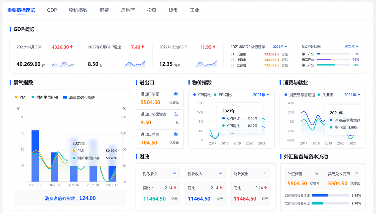 宏觀指標拆解:通過六大方面宏觀指標的分析拆解,運用可視化手段直觀展示宏觀經濟概況;