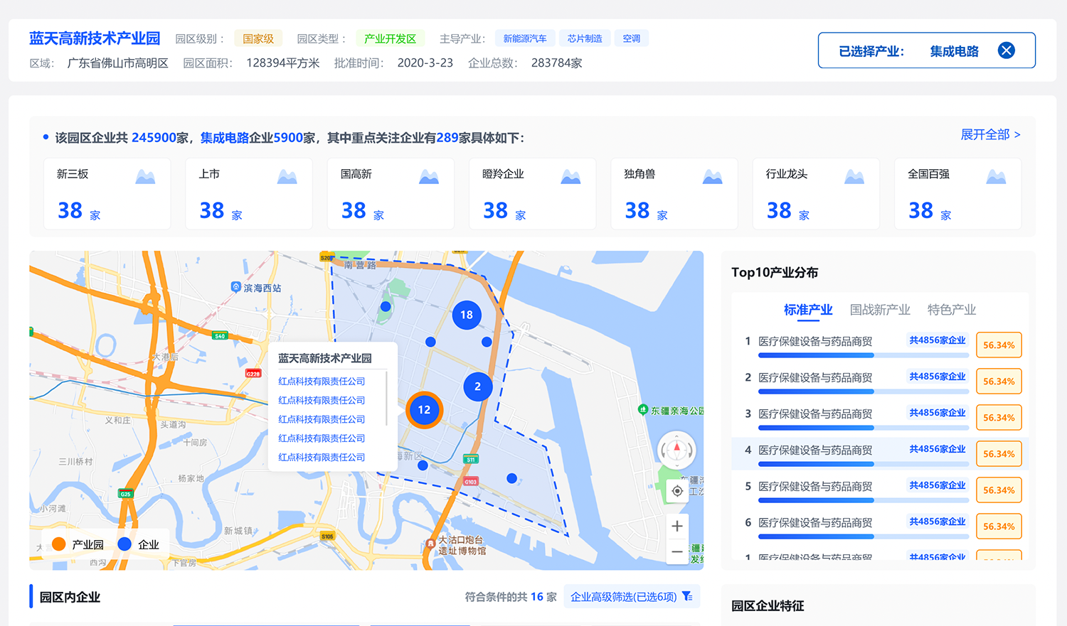 產業園地圖:了解區域產業布局,輔助政府規劃園區和制定優惠政策;從產業園中挖掘集中市場機會,從同類企業、上下游企業、遷入遷出企業中挖掘潛在客戶。